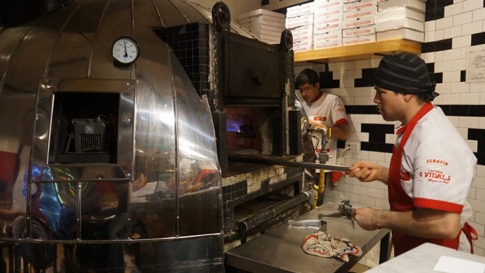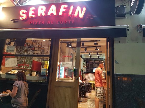 Decidí embarcarme en un viaje por las calles de Recoleta y Retiro, donde el que busca siempre encuentra. Llego, mojado por la llovizna, a Serafín; un clásico y conocido por todos, padres, abuelos, hijos y hasta nietos. Ubicado sobre Avenida Del Libertador y señalizado con un cartel de neón, es imposible no verlo. Me recibe un hombre que estaba acomodando unas empanadas hace unos momentos. –“Hola, si ¿querés algo?”- y continúa con su trabajo. Atentos pero laburadores, unos trabajando en el horno y otros detrás del mostrador atendiendo a un joven repartidor de Glovo. A pesar de ser conocida y legitimada por muchos como la mejor pizza, el lugar se encontraba casi vacío, solo una familia comiendo y riendo en una mesa del fondo.