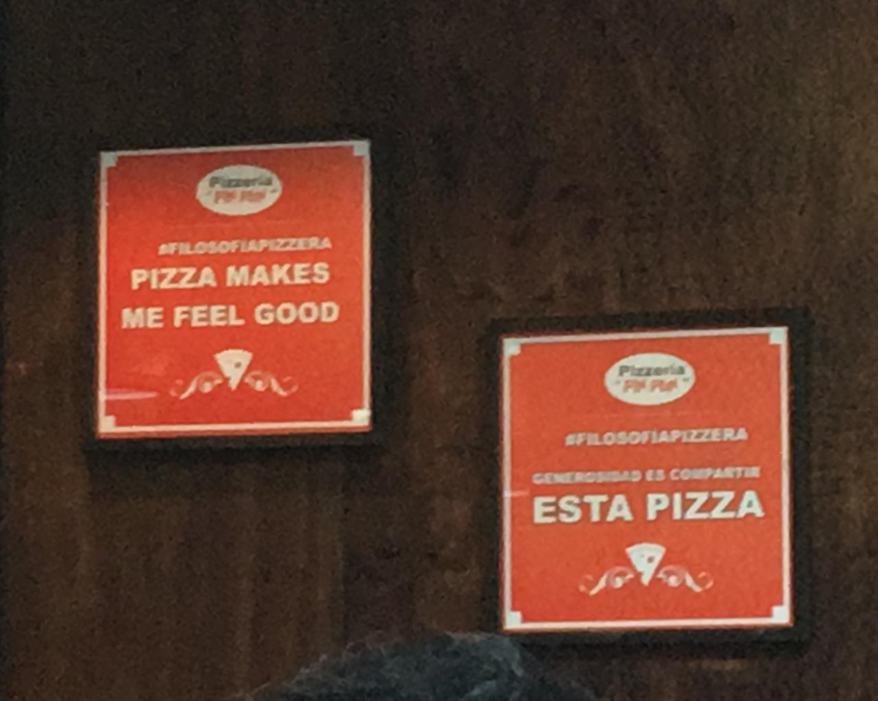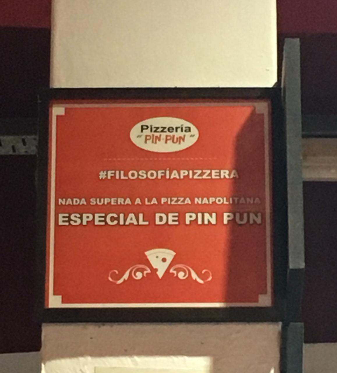 Después de escuchar atentos sus anécdotas y sugerencias, pedimos la pizza napolitana especial de Pin Pun. En los quince minutos que habrá tardado en llegar la pizza, nos convidaron con un pan de pizza riquísimo, y mientras tanto me puse a mirar atentamente el local. Estaba repleto de gente, bien de barrio, todos relajados. La mayoría estaba en grupos numerosos: familias, grupos de colegas festejando el fin de año, o varias parejas compartiendo unas pizzas con la genial jarra de cerveza. La decoración es muy clásica; hay carteles grandes con fotos de sus platos, noticias enmarcadas en un tamaño tal par ser visibles en todo el local, textos estilo fileteado, botellas de vidrio de salsa de tomates y otros ingredientes de pizzas exhibidos. Lo que más me llamó la atención fueron diversos cartelitos rojos con letras blancas colgados por todo el local, con el hashtag «#filosofiapizzera» y frases como «pizza makes me feel good» o «generosidad es compartir esta pizza», colocados tal vez con la intención de mantener un espíritu clásico pero aggiornarse a los tiempos digitales que corren.