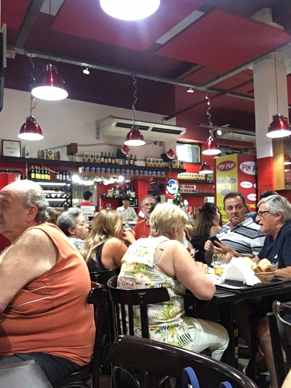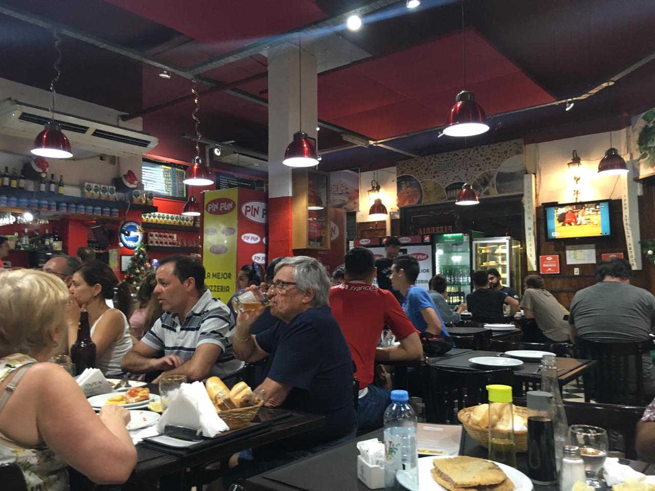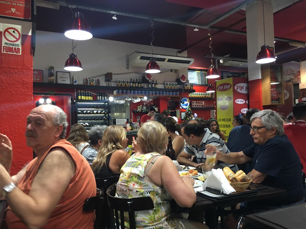 Una vez sentados, porque fui con mi novio, nos atendió «el pelado», un mozo célebre por su buen servicio. «El pelado» es un hombre de unos casi cincuenta años, ojos de un celeste profundo, pelado (obviamente) y con una gran sonrisa. Probablemente hombre de familia, casado, por la alianza dorada que se puede ver en el dedo anular de su mano izquierda. Su uniforme estaba impecable: con la clásica camisa blanca con vivos rojos y el delantal rojo por encima. El oficio de mozo y la experiencia brotan por sus poros. «Buenas noches chicos, ¿qué van a pedir? ¿Los puedo orientar?», nos dijo enseguida de manera educada, amable pero con distancia, como a mi criterio debe ser; características de las que los mozos de hoy en día carecen porque lo ven tal vez como un trabajo pasajero y no un oficio. Charlamos un poco, y nos contó que trabaja en el bodegón desde el 95. Fue y es el único trabajo que tuvo, y recuerda con nostalgia su primer día, en el que el dueño del local lo recibió de buena manera y le enseñó sobre los gajes del oficio. Nos contó anécdotas, algunas de famosos que fueron al local y otras de cuando Pin Pun fue elegida como mejor pizzería de la Ciudad de Buenos Aires. Percibí, que de manera muy leve, se le entrecortaba la voz, mientras nos decía que sus compañeros eran como familia.